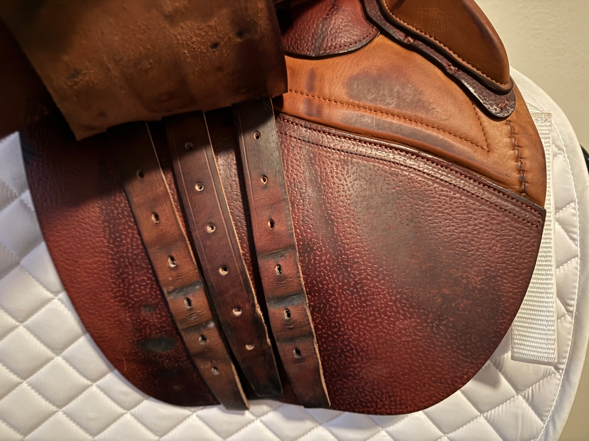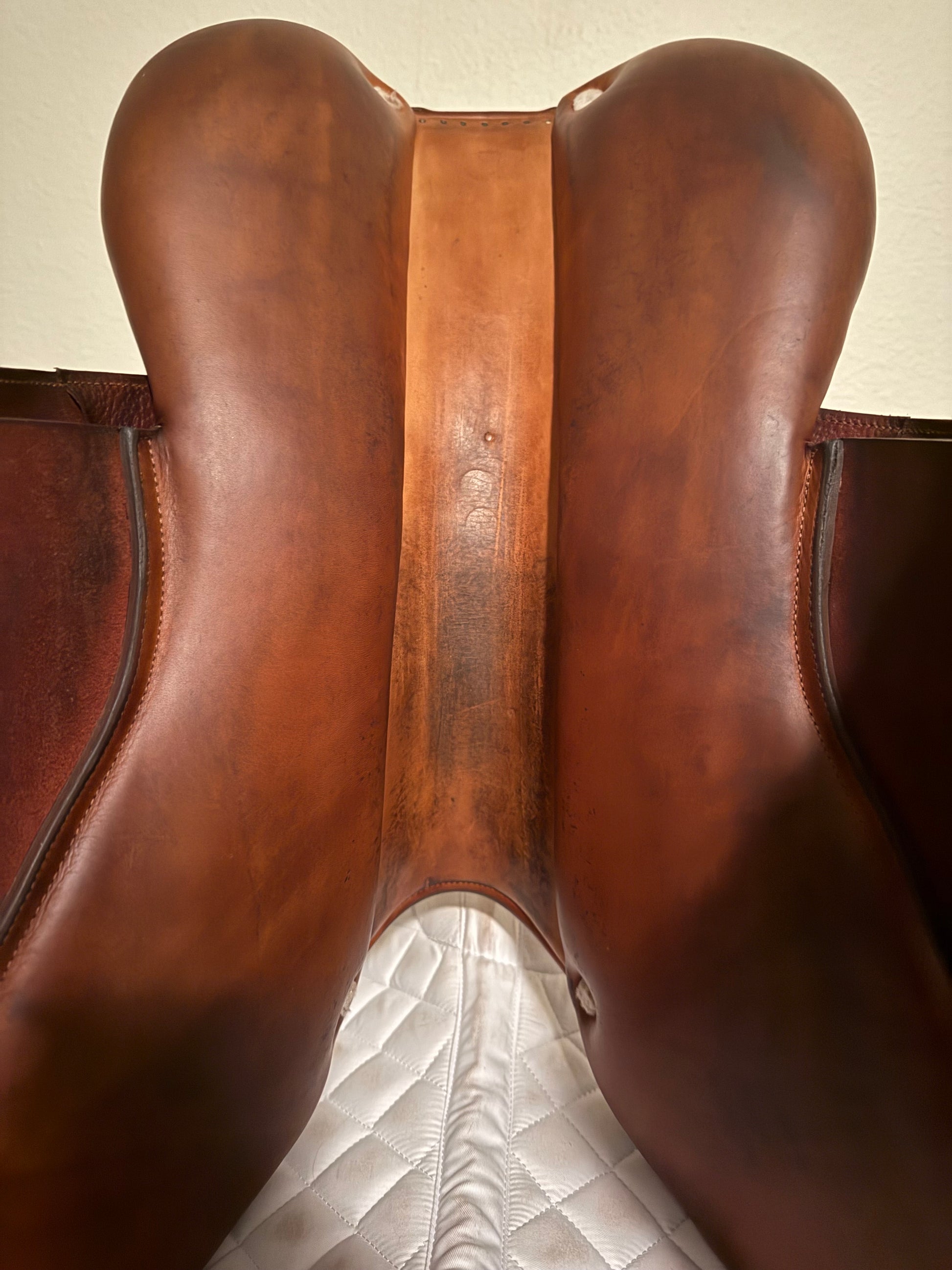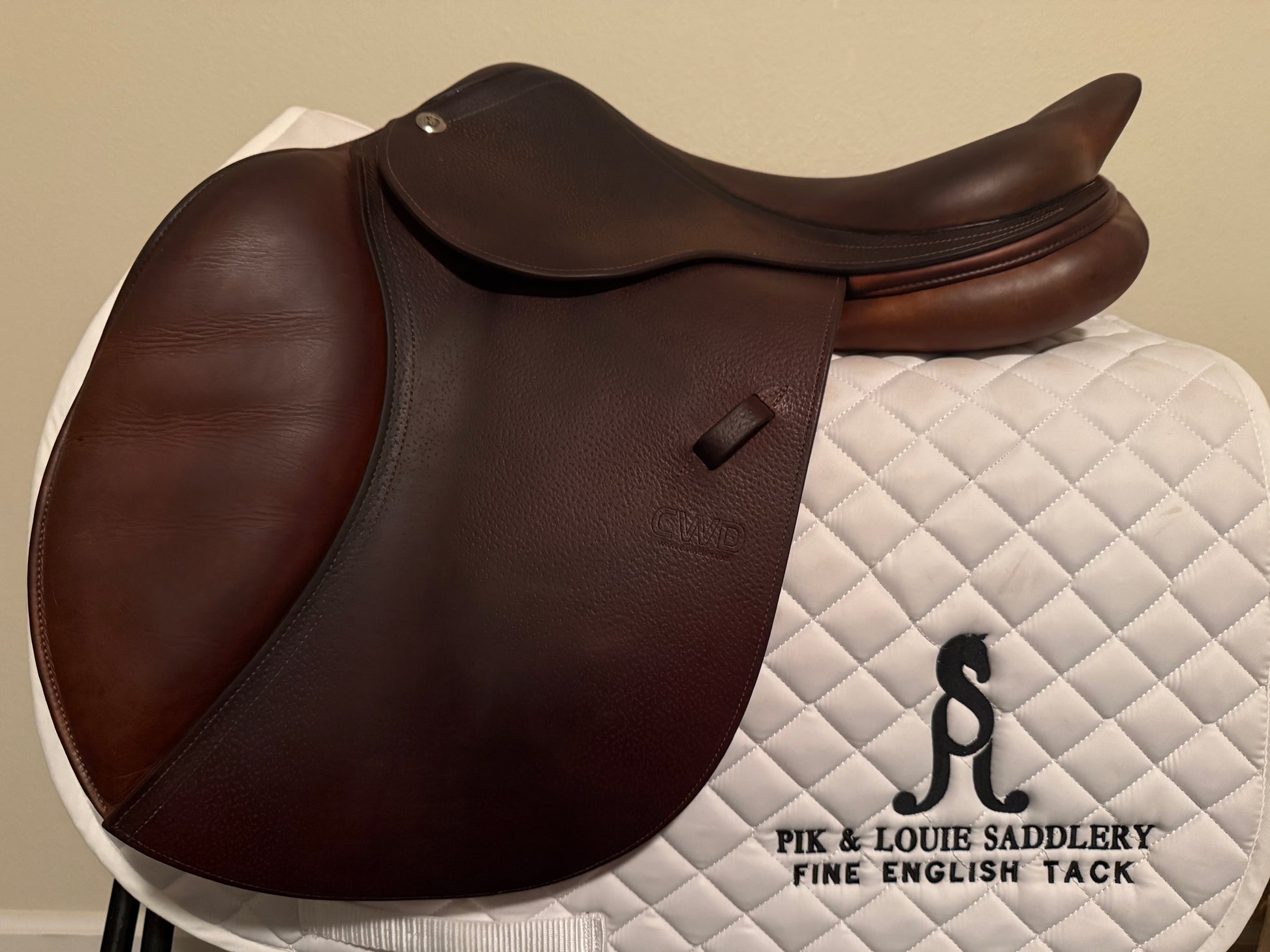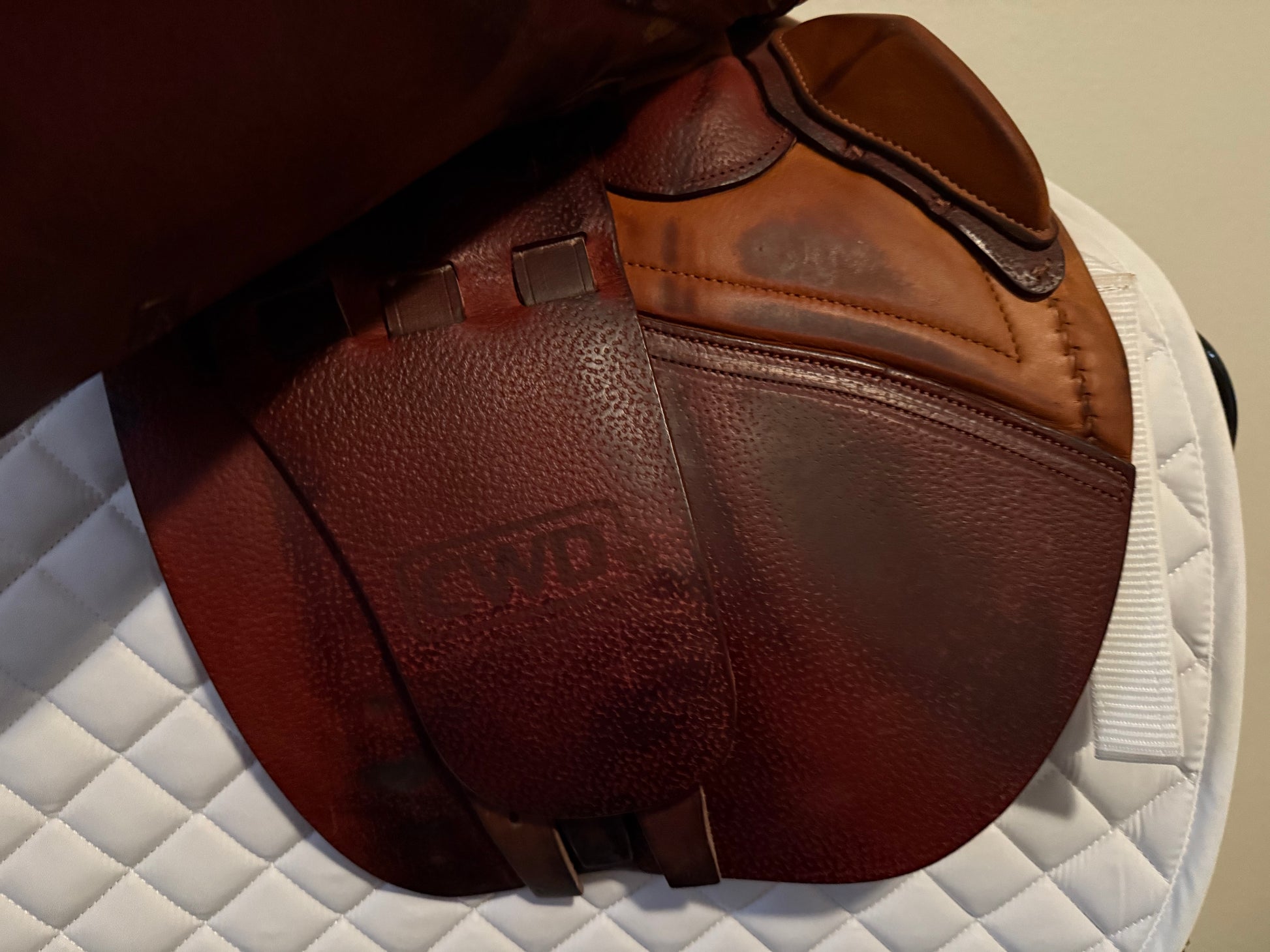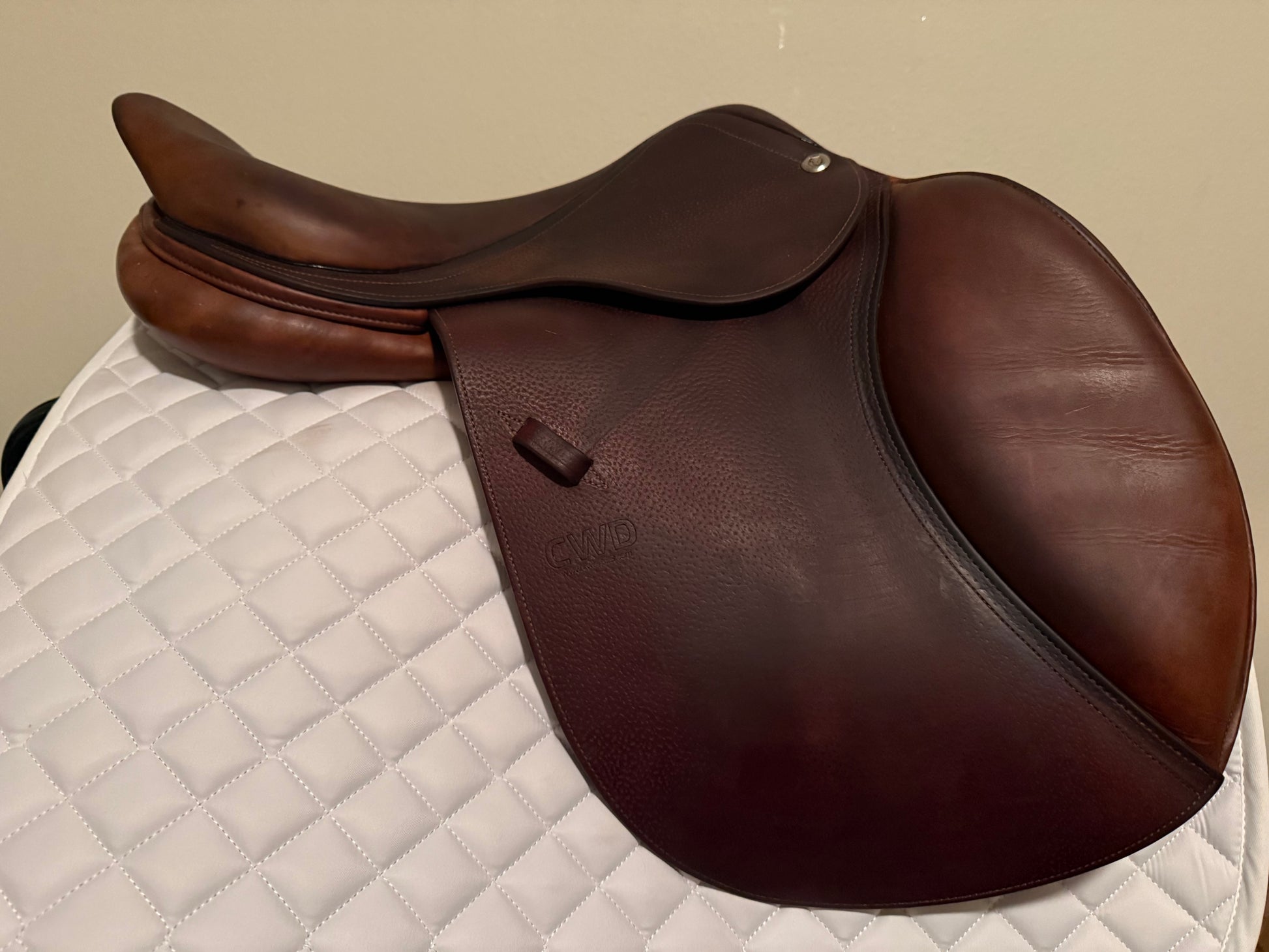 This is a gently used 2018 CWD. The leather is a bit splotchy but very lightly used. Will improve with conditioning.
