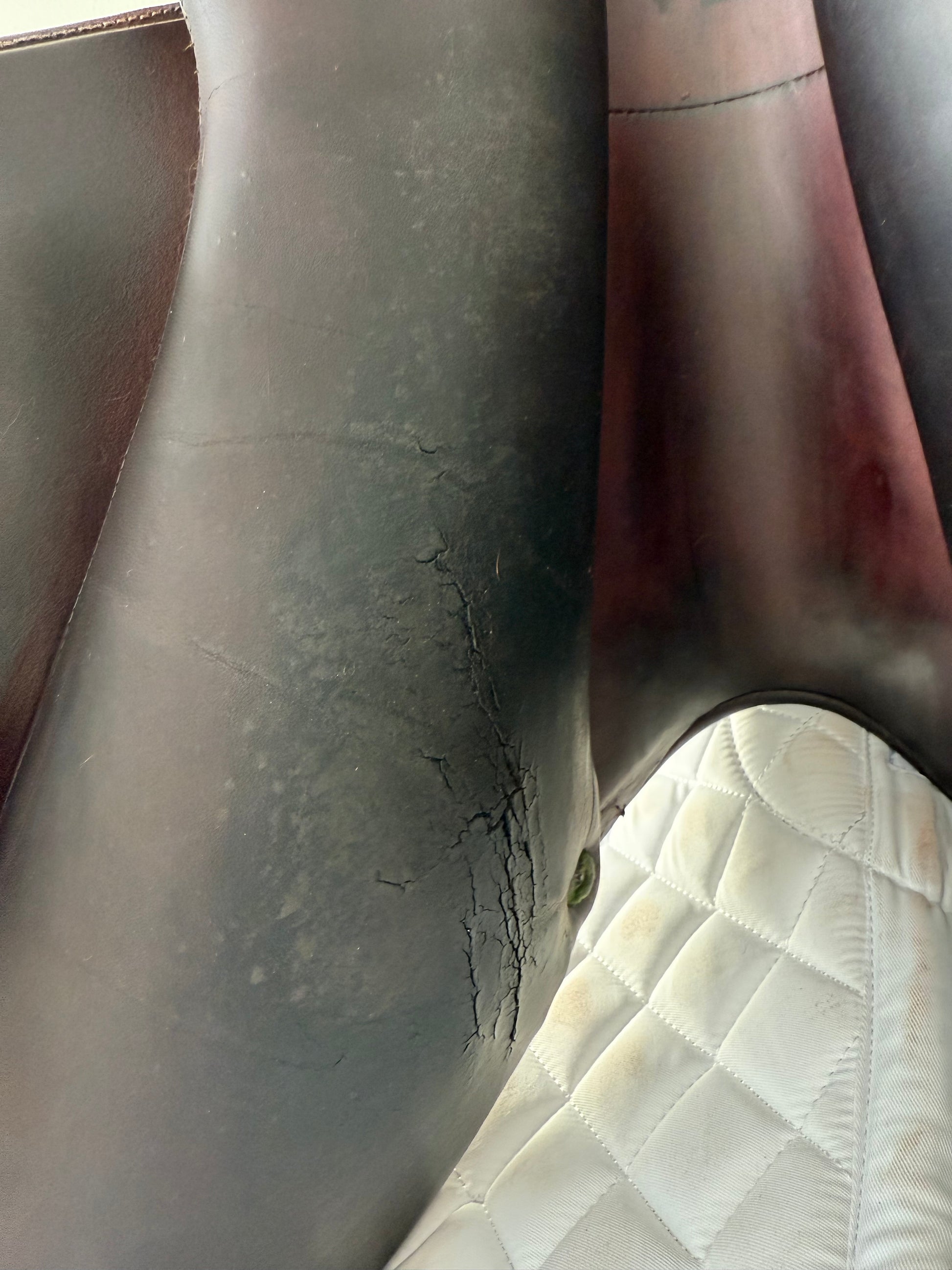 This saddle is in overall good condition but is showing signs of use. There is some where under the saddle on the panel leather. The seat has some minor spotting. Otherwise, good used condition.