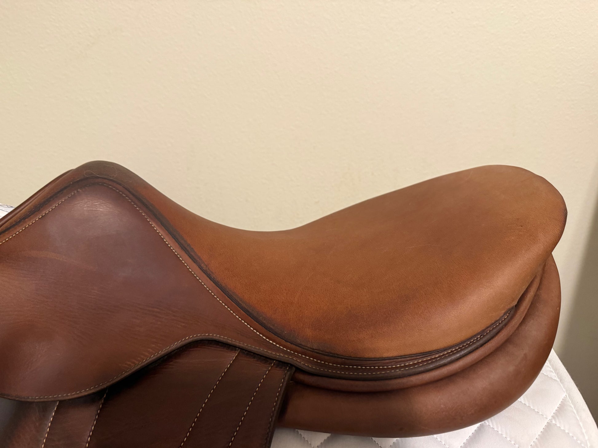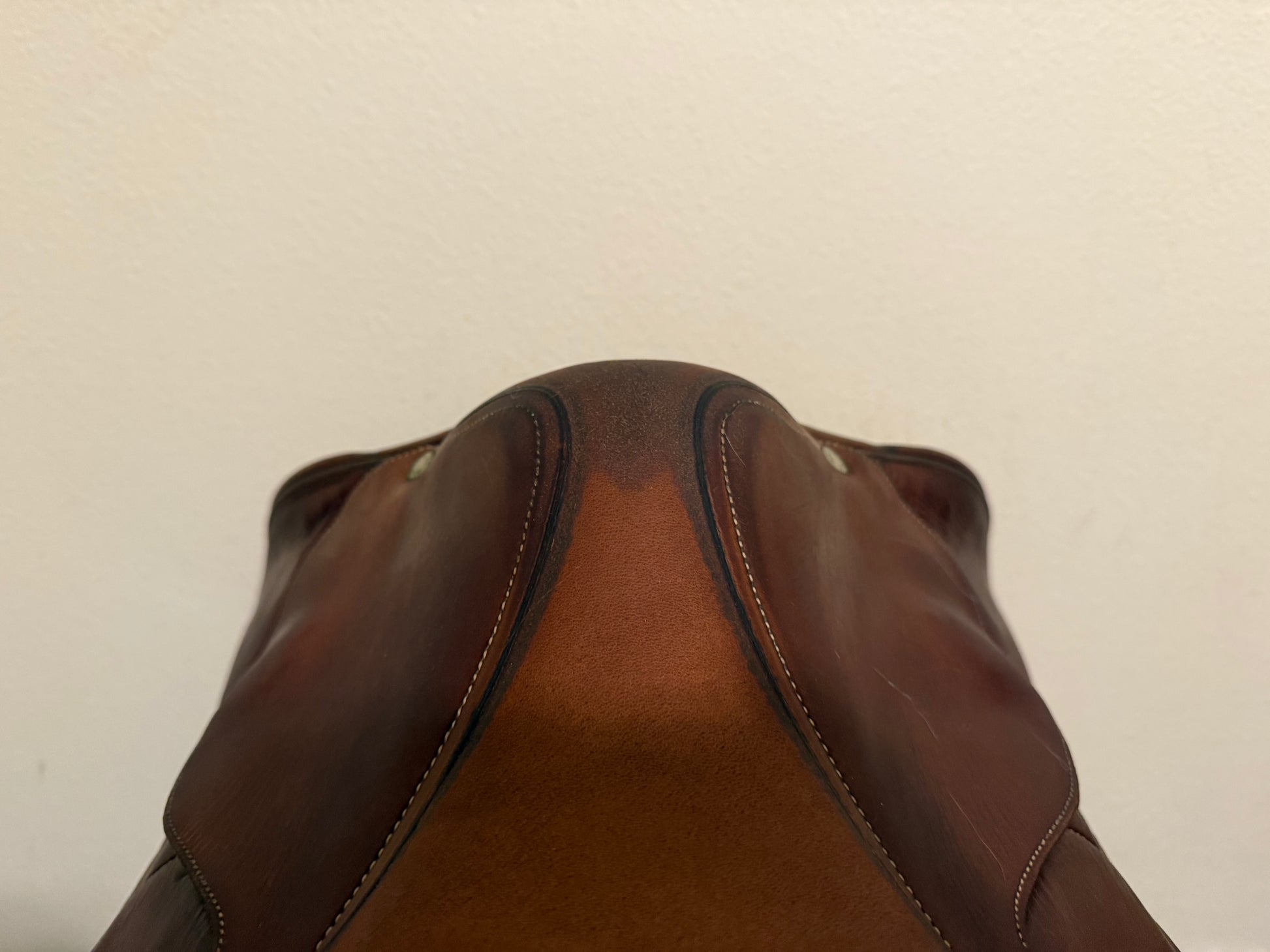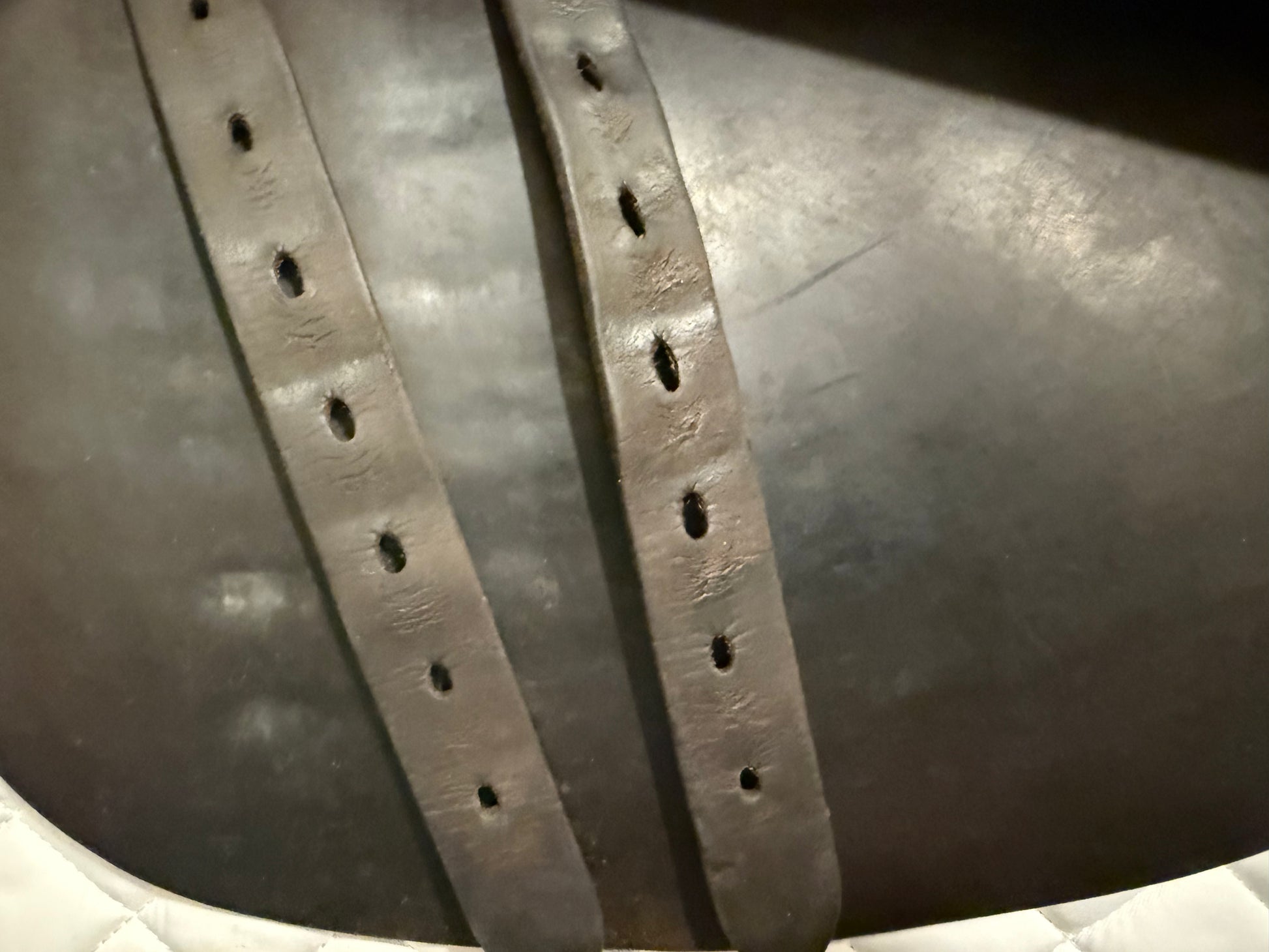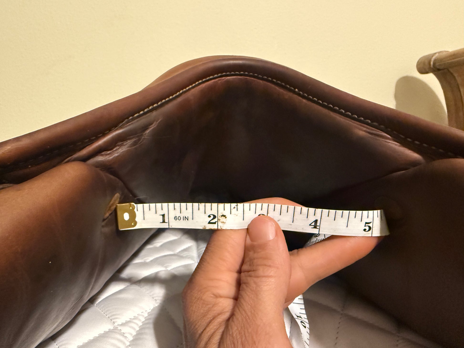 It appears the panels on this saddle have been made to allow the saddle to sit wide. I’m not sure if this is a factory or “after-market” adjustment. This saddle is super close contact with no fill in the knee rolls and a narrow twist.