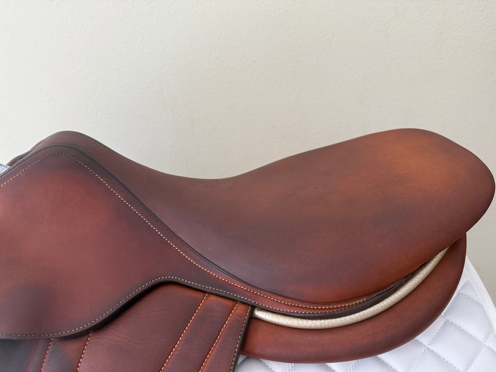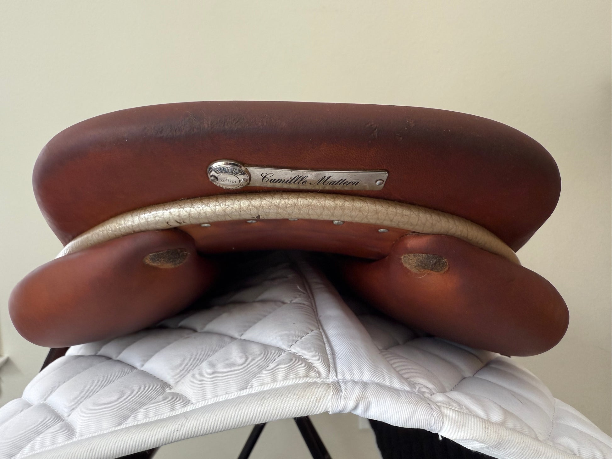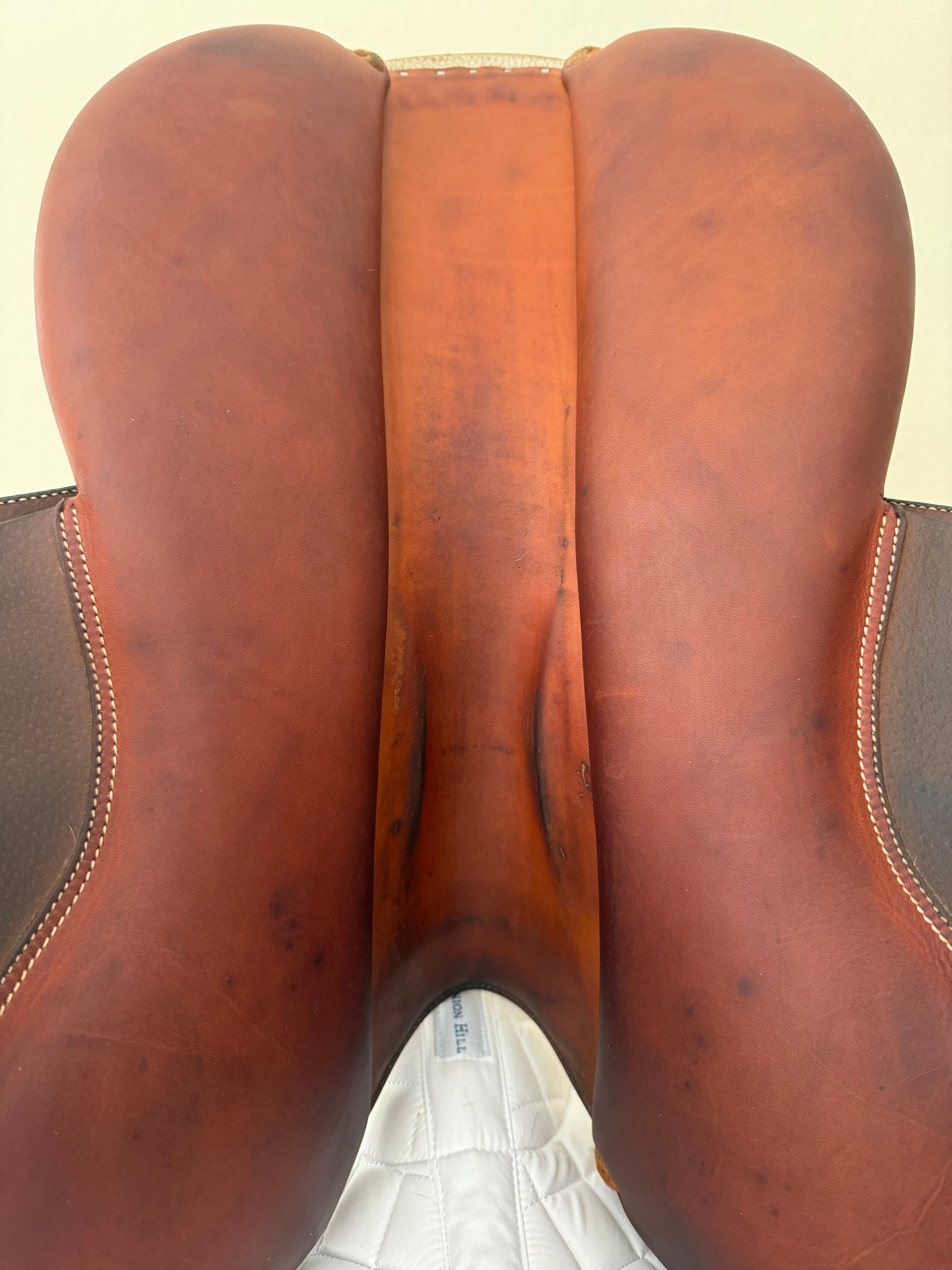 This is a very nice saddle with typical signs of use. It offers a narrow twist, flat seat and closest contact feel. To enhance the closeness, the front blocks were removed, there is no fill in the knee rolls - ultra close contact. There is a small rub on one rear block under the flap.