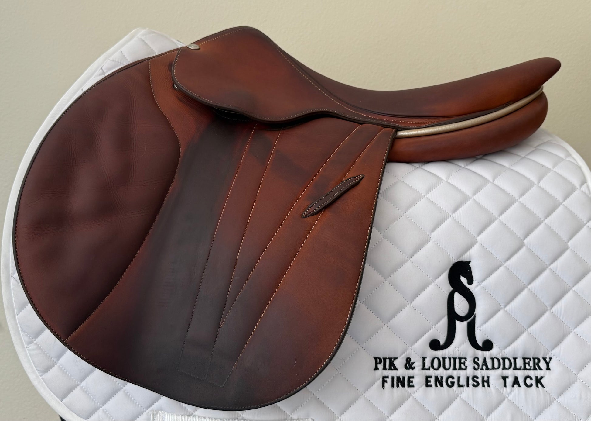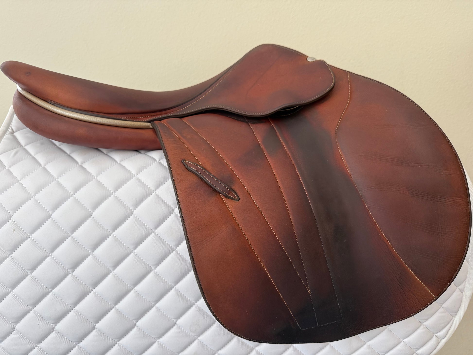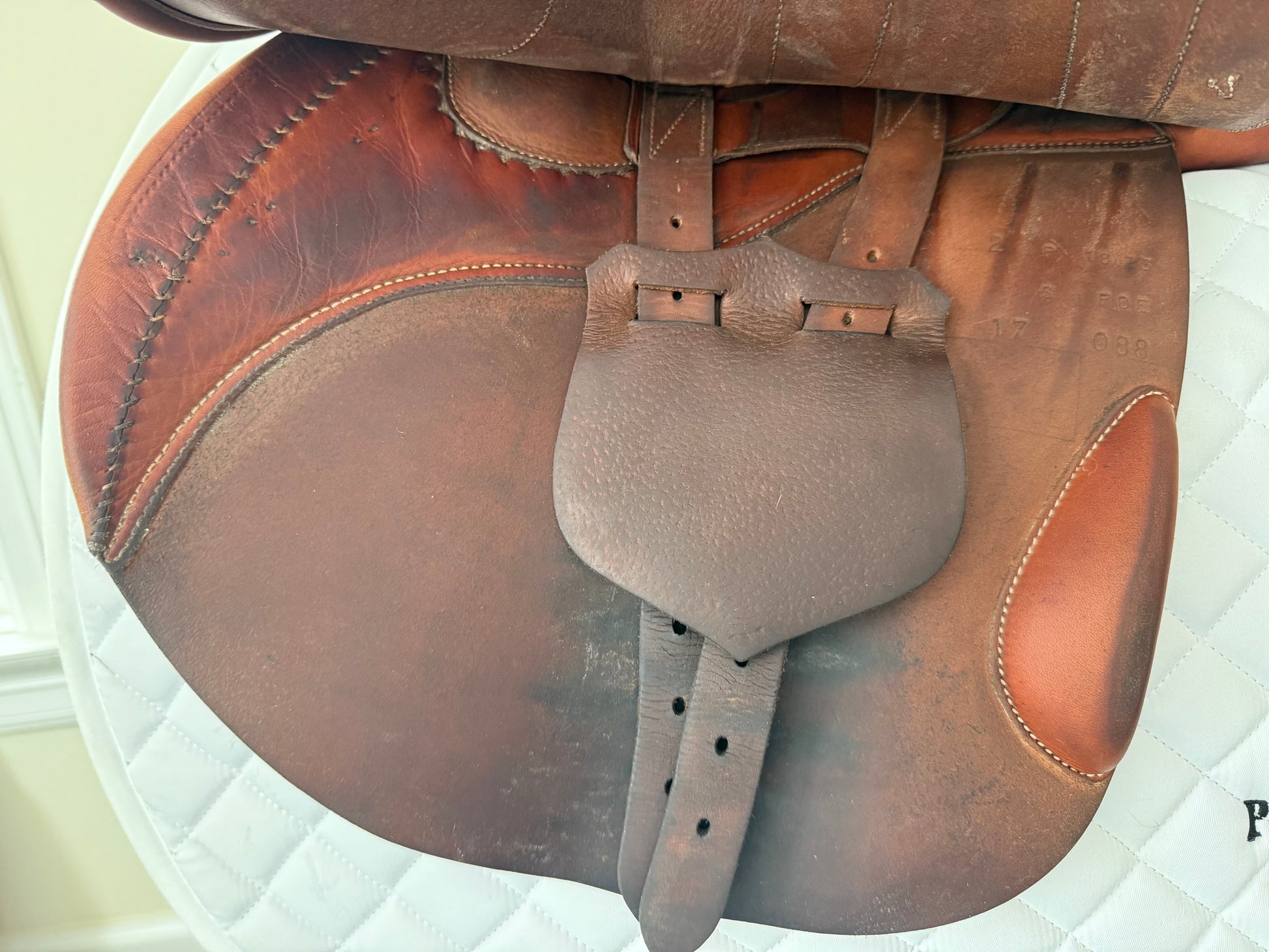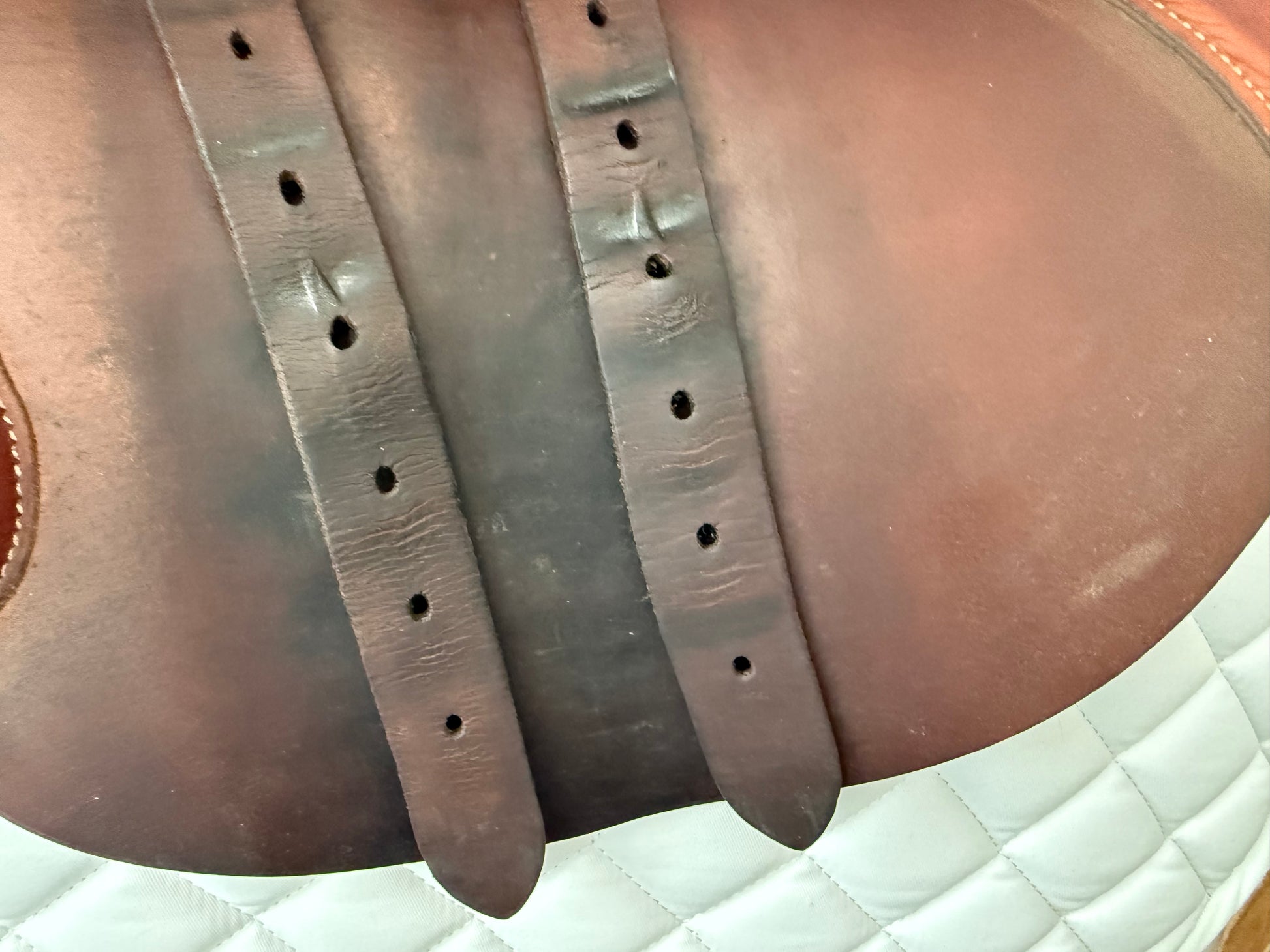 This is a very nice saddle with typical signs of use. It offers a narrow twist, flat seat and closest contact feel. To enhance the closeness, the front blocks were removed, there is no fill in the knee rolls - ultra close contact. There is a small rub on one rear block under the flap.
