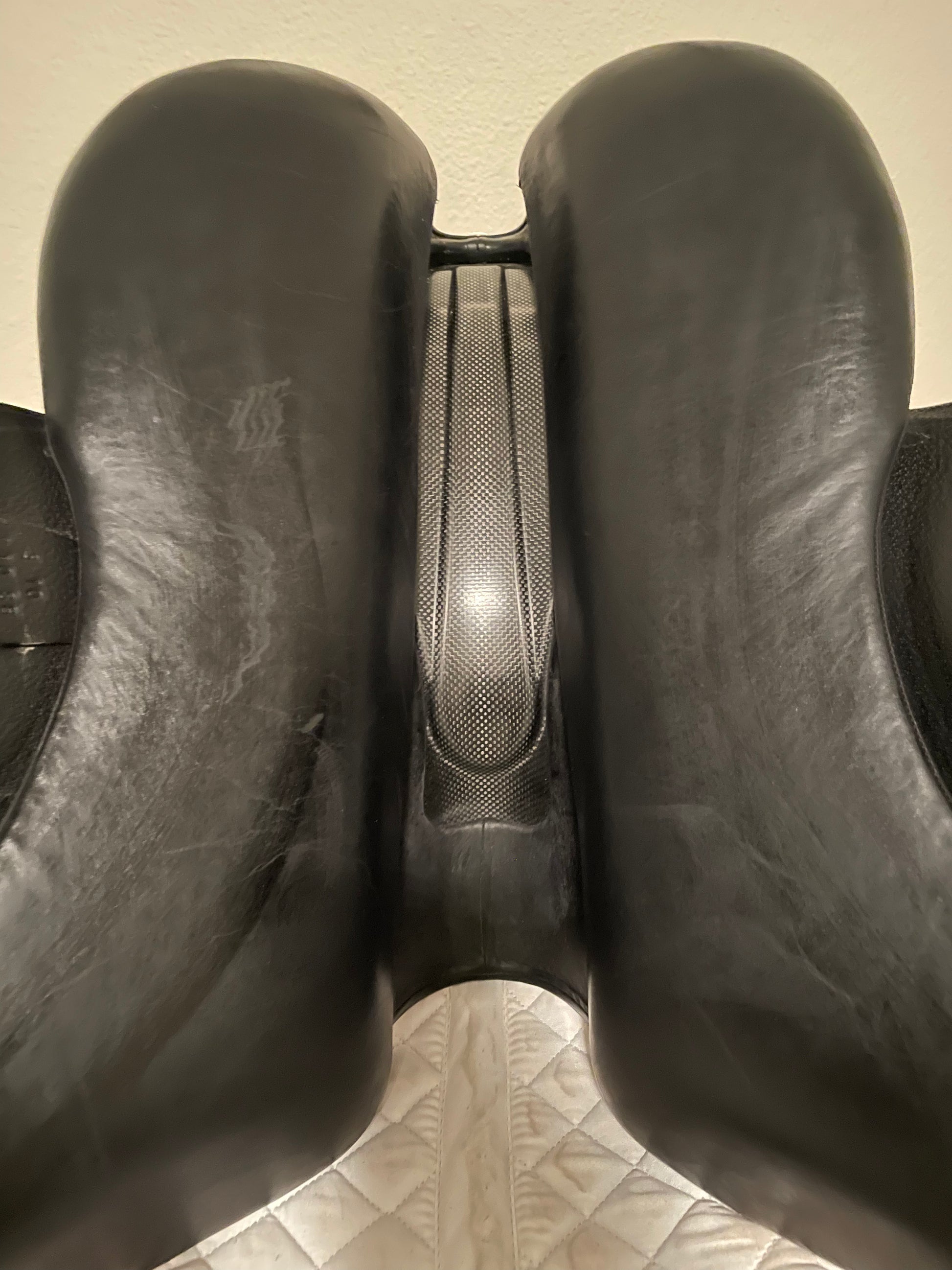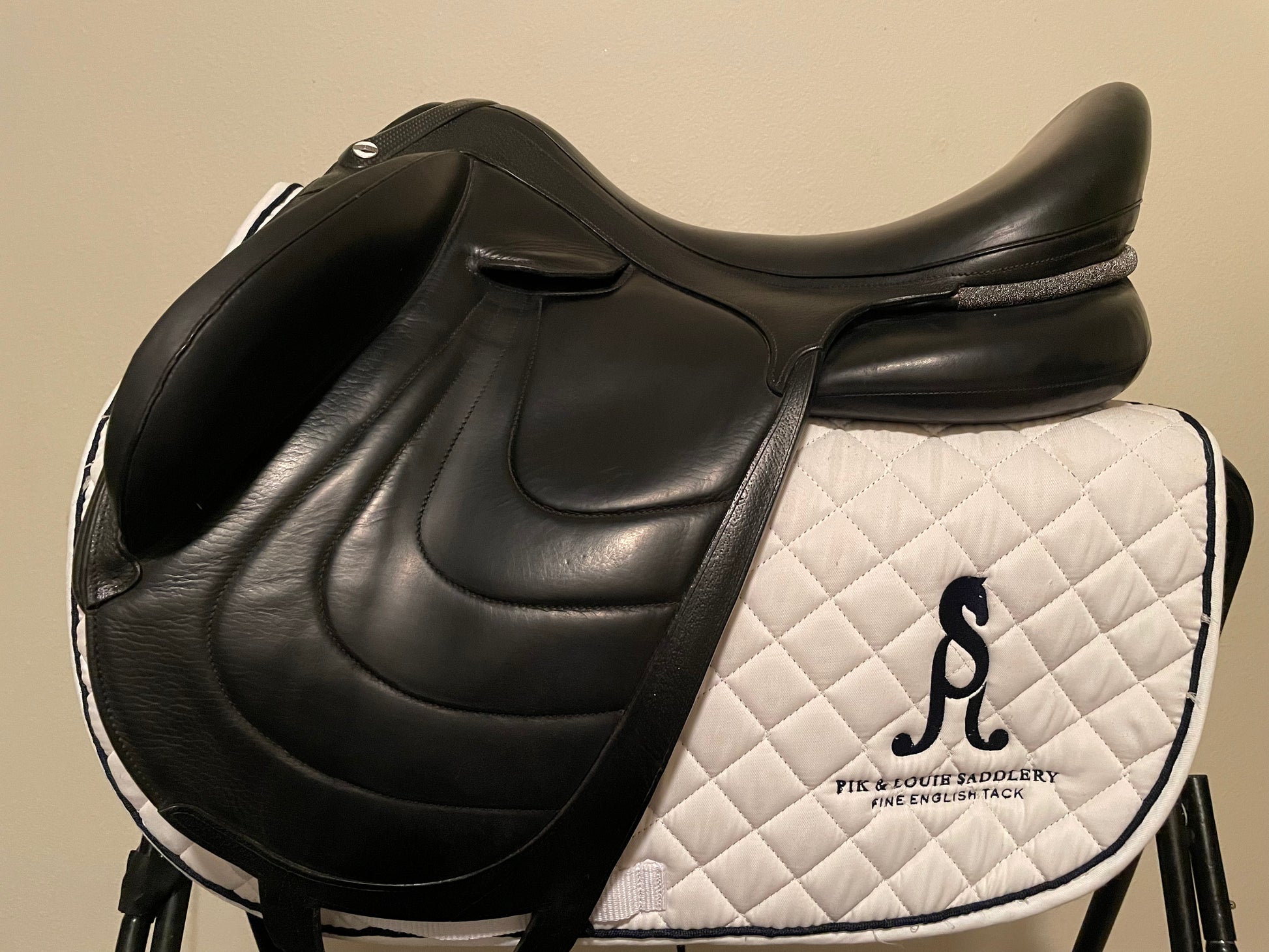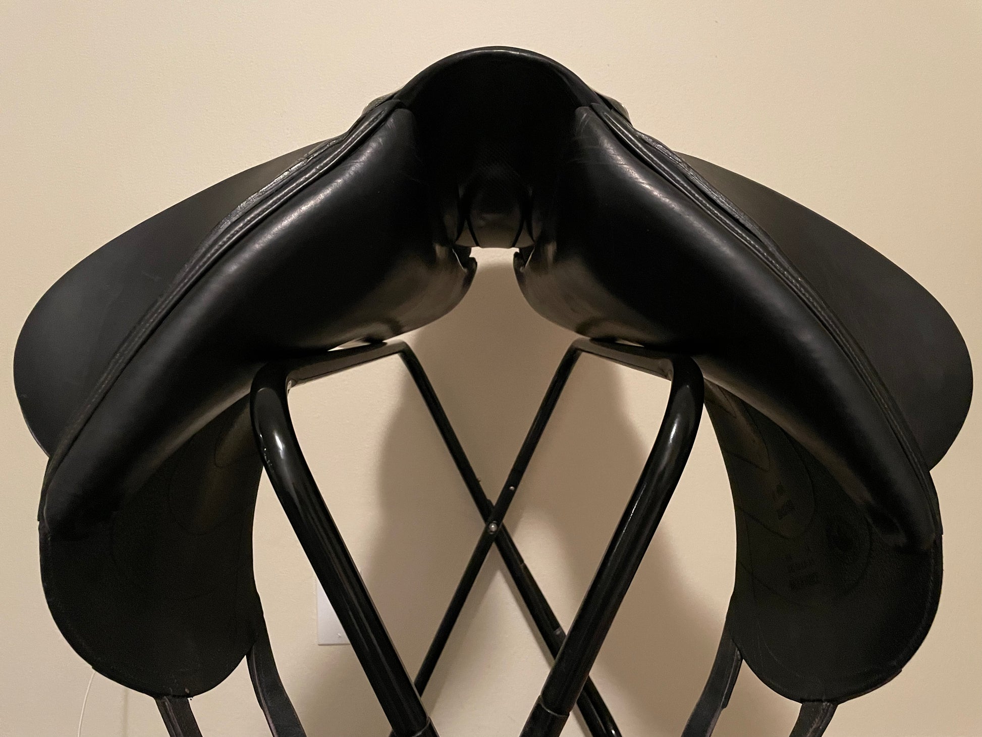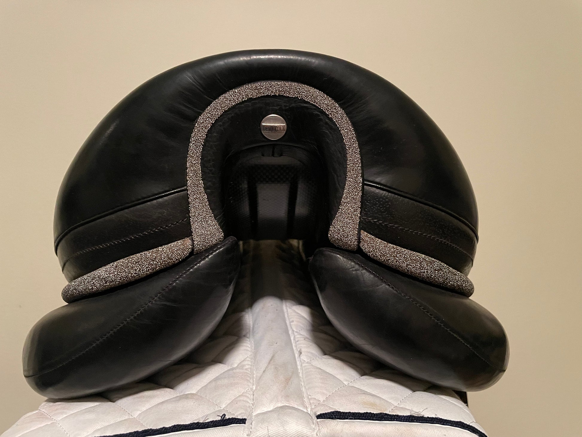 This saddle is drop dead gorgeous and blinged out! It’s flawless and well taken care of. The 18.5” seat with short flap is truly a unique size, well suited for the rider needing a little more room in the seat without adding more length in the flap.