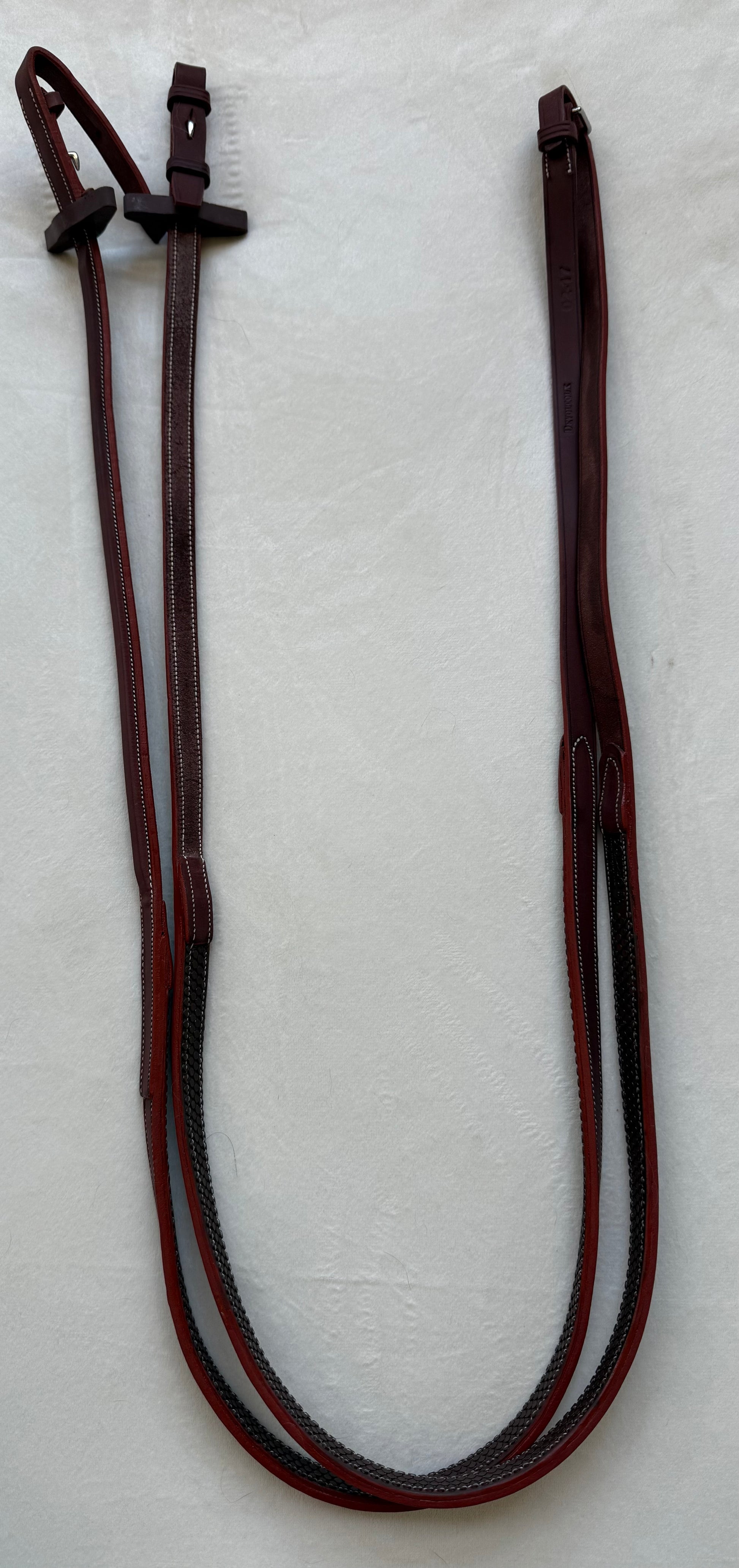 Gorgeous pair of Devoucoux semi rubber reins (leather outside with inner rubber grip). These reins are perfect for any ring. Total length is approximately 120”